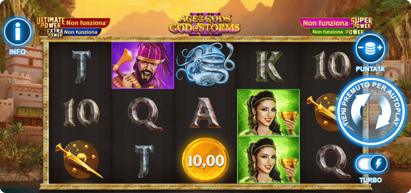 Hay un gran símbolo “Wild” de oro que sustituye a todos los demás, excepto el símbolo Scatter representado por el nombre del juego: Age Of The Gods.